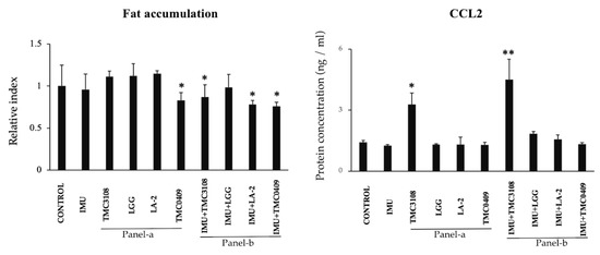 Previously, we demonstrated that some immunobiotic strains are able to differentially modulate fat accumulation and proinflammatory mediators’ expression during short term adipogenic differentiation of PIP cells [16]. Then, we aimed to evaluate whether the same lactobacilli and bifidobacteria strains were able to modulate fat accumulation and CCL2 expression during LTAD. For this purpose, two sets of experiments were performed. First, porcine adipocytes were treated directly with bacterial strains. As shown in Figure 11 (Panel-a) no effect on fat accumulation was observed for the evaluated strains with the exception of L. paracasei TCM0409, which significantly reduced this parameter. In addition, only B. bifidum TCM3108 induced a significant up-regulation of CCL2 expression. In a second set of experiments, we performed several in vitro steps to simulate LAB-immune cells-adipocytes interaction. Antigen presenting cells isolated from porcine Peyer’s patches were stimulated with the different LAB strains and the cell free supernatants (CFS) were collected. Adipocytes were stimulated with the different CFS obtained in the previous step, and fat accumulation and CCL2 expression were evaluated. The CFS from immune cells stimulated with TCM3108, LA-2 and TCM0409 strains significantly reduced fat accumulation while only CFS from TCM3108 treatment improved CCL2 expression (Figure 11: Panel-b).