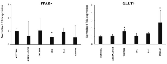 To gain further insight into the CFS mediated regulation of adipogenesis, the mRNA expression of PPARγ and GLUT4 were quantified. As shown in Figure 12, only the CFS from L. rhamnosus GG significantly down-regulated the expression of PPARγ, while TCM3108 and TCM0409 treatments up-regulated GLUT4 expression.