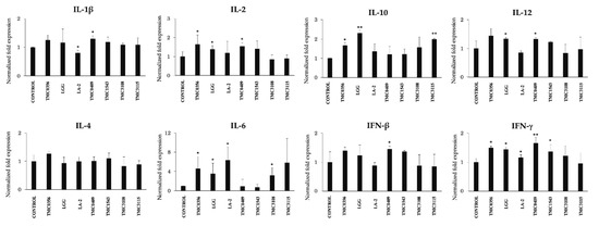 Finally, we aimed to characterize the cytokine profile induced by LAB strain on porcine antigen presenting cells that would be responsible for the effects on porcine adipocytes. A strain-dependent ability in the modulation of cytokine expression in porcine intestinal immune cells was observed (Figure 13). The most remarkable effect was found for L. paracasei TMC0409, which was able to significantly increase the expressions of IL-1β, IL-2, IL-12, IFN-β and IFN-γ. L. rhamnosus GG increased the mRNA expression levels of IL-10, IL-12, IL-6 and IFN-γ (Figure 13). On the other hand, L. rhamnosus LA-2 significantly reduced the expression of IL-1β while it improved the levels of IL-6 and IFN-γ (Figure 13). Lactobacillus gasseri TMC0356 stimulation increased the expression of IL-2, IL-6, IL-10 and IFN-γ when compared with untreated control cells. B. bifidum TCM3115 enhanced the expression of IL-6 and IL-10 while S. thermophilus TCM1543 increased IFN-β and IFN-γ expression. B. bifidum TMC3108 only increased the expression of IL-6 when compared to control cells (Figure 13).
