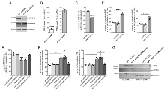 As another means to analyze the effect of RAB10 inactivation on EGF binding and EGFR trafficking, we performed siRNA experiments. Knockdown of RAB10 caused a pronounced decrease in RAB10 protein levels 48 h post-transfection (Figure 2A,B), while the steady-state levels of several other RAB proteins including RAB8A (Figure 2A,B) or RAB7A remained unchanged (Figure S2). The knockdown of RAB10 was accompanied by a significant decrease in EGF surface binding and EGFR degradation (Figure 2C,D). A siRNA-resistant version of RAB10, but not wildtype siRNA-sensitive RAB10, rescued the effect of RAB10 knockdown on EGF binding and EGFR trafficking (Figure 2E–G), indicating that the effects were owing to the specific knockdown of RAB10. Thus, siRNA of RAB10 mimics the endolysosomal trafficking deficits mediated by G2019S LRRK2 expression.