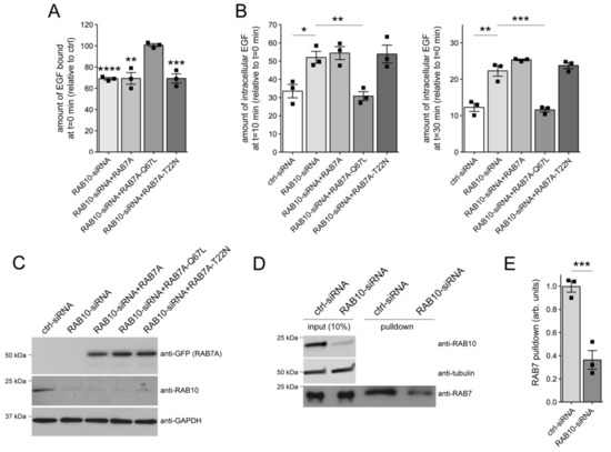 To gain direct evidence for a decrease in RAB7A activity upon siRNA of RAB10, we performed effector pulldown assays. Cells were treated with either control siRNA or with RAB10-siRNA, and cell lysates were subjected to pulldowns with the RAB7-binding domain of RILP to selectively isolate active, GTP-bound RAB7 [31,59]. Studies of this type further indicate that the fraction of endogenous active RAB7 was significantly reduced upon RAB10-siRNA (Figure 3D,E).
