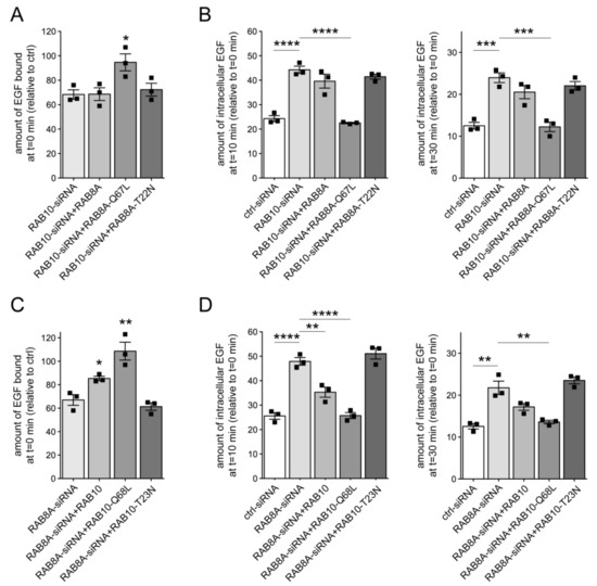 RAB8A and RAB10 are functionally redundant in regulating endolysosomal EGF trafficking. (A) HeLa cells were either transfected with ctrl-siRNA or RAB10-siRNA, and co-transfected with GFP-tagged RAB8A constructs as indicated, and the amount of surface-bound fluorescent EGF was quantified. N = 3 independent experiments; * p < 0.05. (B) Cells were transfected with ctrl-siRNA or RAB10-siRNA, and co-transfected with GFP-tagged RAB8A constructs as indicated, and internalized fluorescent EGF was quantified at 10 min (left) and 30 min (right). N = 3 independent experiments; *** p < 0.005; **** p < 0.001. (C) HeLa cells were either transfected with ctrl-siRNA or RAB8A-siRNA, and co-transfected with GFP-tagged RAB10 constructs as indicated, and the amount of surface-bound fluorescent EGF was quantified. N = 3 independent experiments; * p < 0.05; ** p < 0.01. (D) Cells were transfected with ctrl-siRNA or RAB8A-siRNA, and co-transfected with GFP-tagged RAB10 constructs as indicated, and internalized fluorescent EGF was quantified at 10 min (left) and 30 min (right). N = 3 independent experiments; ** p < 0.01; **** p < 0.001.