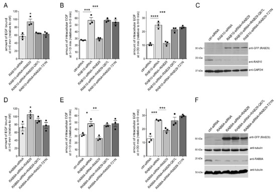 Deficits in EGF trafficking due to knockdown of RAB8A or RAB10 are rescued upon RAB29 expression. (A) HeLa cells were either transfected with ctrl-siRNA or RAB10-siRNA, and cotransfected with GFP-tagged RAB29 constructs as indicated, and the amount of surface-bound fluorescent EGF quantified. N = 3 independent experiments; * p < 0.05. (B) Cells were transfected with ctrl-siRNA or RAB10-siRNA, and cotransfected with GFP-tagged RAB29 constructs as indicated, and internalized fluorescent EGF was quantified at 10 min (left) and 30 min (right). N = 3 independent experiments; *** p < 0.005; **** p < 0.001. (C) Cells were either transfected with ctrl-siRNA or RAB10-siRNA, and transfected with GFP-tagged RAB29 constructs as indicated, and cell extracts (30 μg) were analyzed by Western blotting for GFP-RAB29 levels, endogenous RAB10 levels, and GAPDH as loading control. (D) HeLa cells were either transfected with ctrl-siRNA or RAB8A-siRNA, and cotransfected with GFP-tagged RAB29 constructs as indicated, and the amount of surface-bound fluorescent EGF was quantified. N = 3 independent experiments; * p < 0.05. (E) Cells were transfected with ctrl-siRNA or RAB8A-siRNA, and cotransfected with GFP-tagged RAB29 constructs as indicated, and internalized fluorescent EGF was quantified at 10 min (left) and 30 min (right). N = 3 independent experiments; * p < 0.05; ** p < 0.01; *** p < 0.005. (F) Cells were either transfected with ctrl-siRNA or RAB8A-siRNA, and transfected with GFP-tagged RAB29 constructs as indicated, and cell extracts (30 μg) were analyzed by Western blotting for GFP-RAB29 levels, endogenous RAB8A levels, and tubulin as loading control.