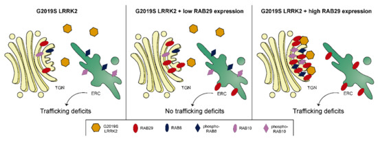 The rescue of the LRRK2-mediated deficits upon RAB29 expression occurred in a manner largely independent of Golgi integrity, suggesting that RAB29 may play role(s) in membrane trafficking in addition to those described at the Golgi complex. Indeed, previous studies indicate that RAB29 colocalizes and interacts with RAB8, and regulates receptor recycling in T cells as well as the trafficking of endosome-derived ciliary cargo at the base of the cilium [75]. As RAB29 expression can functionally complement for the knockdown of either RAB8A or RAB10, it is tempting to speculate that at least a fraction of RAB29 may be localized to the recycling compartment, where it may be able to perform functions overlapping with those of RAB8A and/or RAB10 (Figure 8). Finally, our data show that the reported recruitment of LRRK2 to the Golgi complex by RAB29 [23,54,55,56] is only observed when RAB29 is overexpressed to a larger extent. This is consistent with findings indicating that most endogenous LRRK2 is not present on the Golgi complex, and that phospho-RAB8A/RAB10 is not trapped on the Golgi complex under normal conditions either [39,55,57]. While further work is required to understand the link between RAB29, LRRK2, and the etiology of PD, the present data highlight the possibility that, under more physiological conditions, RAB29 may be a positive regulator of non-Golgi-related membrane trafficking events impaired by pathogenic LRRK2, rather than controlling the localization and activation of LRRK2 at the Golgi complex.