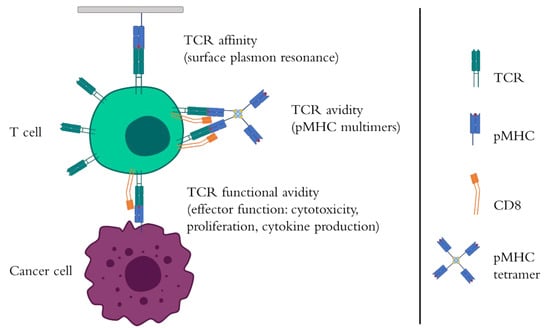 The interaction between the T-cell receptor (TCR) and the peptide-major histocompatibility complex (pMHC). T cells recognize tumor peptide epitopes via the pMHC. Different parameters affect the sensitivity that T cells, including T-cell receptor (TCR)-engineered T cells, will display against the pMHC. TCR affinity describes the strength of the interaction between a single TCR and pMHC. It is commonly measured using a technique named surface plasmon resonance. TCR avidity, on the other hand, reflects the contact of multiple TCRs and pMHCs. For this reason, multimers consisting of a number of pMHCs linked via streptavidin–biotin complexes to a fluorochrome are used to stain antigen-specific T cells and measure their TCR avidity. This parameter also takes into account the effect of T-cell co-receptors such as CD8 in the stabilization of TCR–pMHC binding. Closely related to TCR avidity, functional avidity shows the T-cell fitness to a target antigen in terms of its activation and effector functions, namely, T-cell proliferation, antitumor cytotoxicity, cytokine production, upregulation of activation markers, among others.