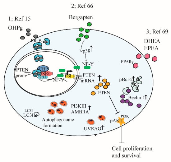 Additional studies address how induction of PTEN expression causes autophagy in hormone-dependent breast cancer cells. For instance, the psoralen bergapten reveals anti-survival effects by inducing PTEN through p38 mitogen-activated protein kinase (p38MAPK), nuclear transcription factor Y (NF-Y) axis, and autophagy [71]. Indeed, autophagy regulators, such as BECLIN 1, Class III PI 3-kinase, UVRAG, and aativating molecule in Beclin 1-regulated autophagy (AMBRA) 1 protein expression increase, together with conversion of the microtubule-associated protein 1A/1B-light chain 3 (LC3) I to LC3-II. Moreover, autophagic vesicles are evidenced in treated cells. The autophagy process is crucially related to the increase of PTEN as demonstrated by specific siRNA studies (see Figure 2, point 2).