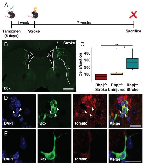 An increased number of neuroblasts is generated after stroke by blocking Notch-signaling. Analysis of Dcx expressing cells in the brain of mice with selective ablation of Rbpj in astrocytes after stroke: (A) Summary of the experimental procedure—mice were administered tamoxifen via intraperitoneal injection for five consecutive days. One week after the last injection, stroke was induced, and the animals were then sacrificed seven weeks later; (B) Overview of Dcx+ cells in the injured and uninjured hemisphere seven weeks after stroke (scalebar = 500 µm); (C) Quantification of the number of Dcx+/Tomato+ cells. For each animal, four sections around the core of the lesion have been selected and quantified. The average number of cells has been compared between the injured and the uninjured hemisphere from the same animals (p = 0.041) and with the injured hemisphere of wild-type mice (p = 0.005). Data were analyzed using a paired t-test, and results are presented as mean ± SD; (D,E) Close-up of clusters; (D) Single close-up; (E) Dcx+/Tomato+ cells found in the penumbra of the stroke area. Arrowheads indicate cells that are positive for both Dcx and Tomato, while the arrow points at a Tomato+ cell (scalebar = 15 µm and 6 µm respectively in D and E).