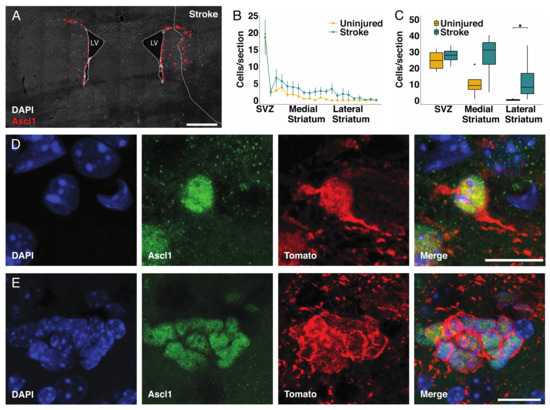 Ascl1+/Tomato+ cells were observed as singlets or in clusters, even in the lateral striatum of the injured hemisphere (Figure 2D,E). Single Ascl+ cells with astrocyte morphology (Figure 2D) as well as clusters of tightly packed Ascl1+ cells (Figure 2E) are indicative of activation of local astrocytes, followed by transit amplifying divisions, rather than migration of cells from, for example, the subventricular zone into the area [17].