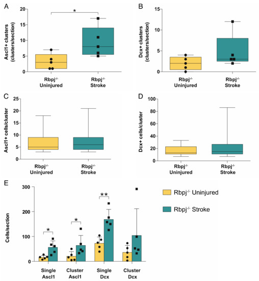 An important question is whether the deletion of Rbpj leads to an increase in the number of astrocytes gaining neurogenic potential following stroke or if it induces the same subpopulation of cells to proliferate further. We previously reported how blocking Notch-signaling in astrocytes induces a neurogenic program, which follows the sequential steps of induction of Ascl1 expression, followed by several cycles of proliferation and, subsequently, commitment to the neuronal lineage with neuroblast differentiation [17]. We observed how neurogenic astrocytes in the mouse striatum generated clusters of transient amplifying progenitor cells and neuroblasts. Each cluster derived from a single neurogenic cell that proliferated several times. Thus, by quantifying the number of clusters, we could infer the number of astrocytes that became neurogenic [17].