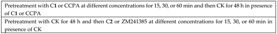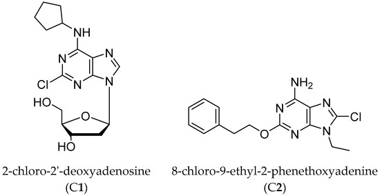 Hence, the A1AR partial agonist 2-chloro-N6-cyclopentyl-2′-deoxyadenosine (2′-dCCPA, C1) [22] and the A2AAR antagonist 8-chloro-9-ethyl-2-phenethoxyadenine (C2) [unpublished], which were synthesized in our laboratory, were utilized (Figure 1).