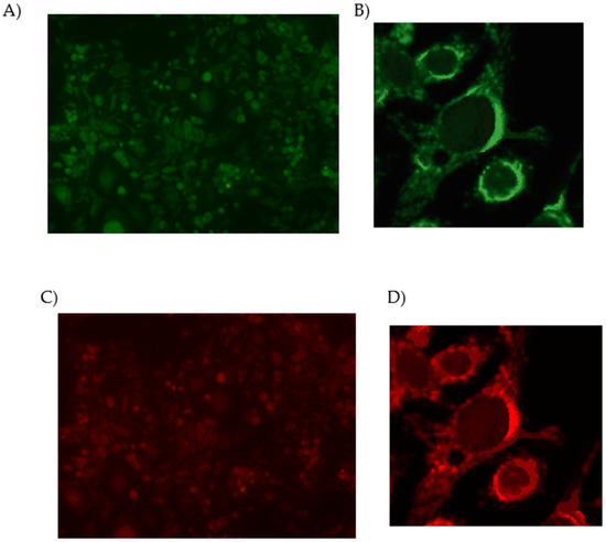 Double immunofluorescence staining in mixed glial cell cultures. (A) Cells were treated with Adenosine A1 Receptor Polyclonal Antibody ALEXA FLUOR® 488 Conjugated (green). (B) Higher magnification displaying A1AR expression on the plasma membrane. (C) Adenosine A2A Receptor antibody ALEXA FLUOR® 594 Conjugated (red). (D) Higher magnification displaying A2AAR expression on the plasma membrane.