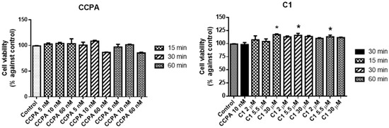 At 15 min of C1 incubation, only the highest tested 30 µM concentration produced a significant increase in cell viability (117 ± 1.3 vs. control) whereas for 30 min already at 5.5 µM the effect was visible (116 ± 1.7 vs. control). The effects measured after 30 min are similar to those obtained after 60 min of incubation. CCPA alone did not change cell viability significantly.