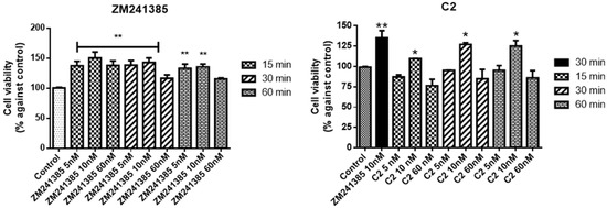 When compared to control, C2 increases cell viability at 10 nM at all incubation times (Figure 4, 110 ± 2.7, 127 ± 3.1, and 125 ± 4.3 vs. control) despite not reaching the reference compound ZM241385 at the same concentration (135 ± 3.5 vs. control). In addition, at the highest concentration of C2, 60 nM, the cell viability is lower than the control suggesting a tendency to toxicity (values nearly 80%).