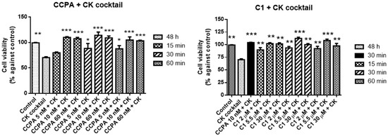 The neuroprotective effect of the compounds against a neuroinflammatory insult was studied performing different experiments. In the first experiment, cells were pre-treated with C1 at 2, 5.5, and 30 µM for 15, 30, and 60 min before adding the CK cocktail for 48 h. CCPA, 10 nM at 30 min, that showed the best effect, was used as reference. C1 and CCPA were present for all experiment duration. Results are reported in Figure 5.