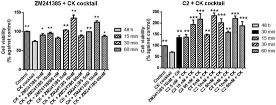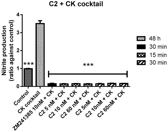 In the second experiment cells were pretreated with 20 ng/mL of CK cocktail for 48 h and then the C2 at 5, 10, and 60 nM for 15, 30, and 60 min was added or the referent compound ZM241385 at the same concentration and incubation time. Results were reported in Figure 6.