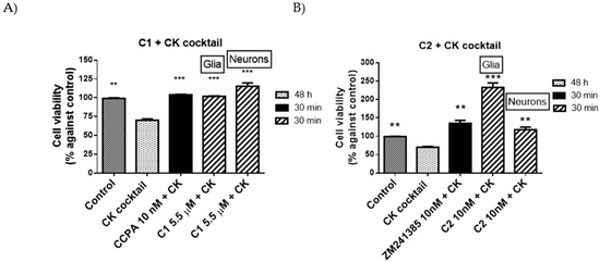 Protective effects of CCPA and C1 against CK aggression on mixed glial cell culture. Percentage of cell viability after treatment with the CK cocktail for 48 h. Results represent the average of 3–5 independent experiments. * p < 0.05, ** p < 0.01, *** p < 0.001 of treated cells against CK.