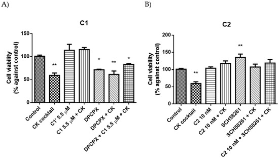 Protective (A) and restoring (B) effects of C1 and C2, respectively, in presence or absence of A1AR (DPCPX) or A2AAR (SCH58261) antagonists in presence or in absence of CK. Percentage of cell viability after treatments. Results represent the average of 3–5 independent experiments. * p < 0.05, ** p < 0.01 of treated cells against control.