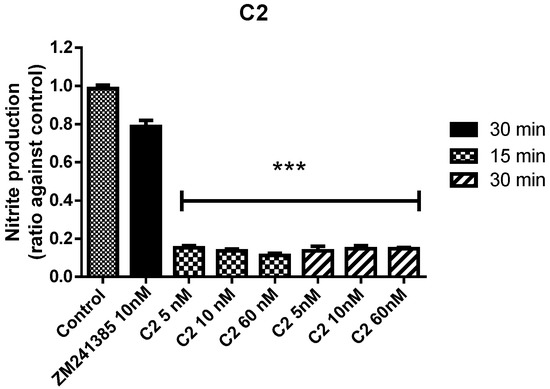 Under normal conditions in the brain, in order to preserve cell functions, the immunological responses counteract the formation of reactive oxygen (ROS) and nitrogen (RNS) species. Since high levels of ROS and RNS species are present in neuroinflammation and associated pathologies, the antioxidant profile of the compounds were evaluated. Compounds 1 and 2 were tested, through Griess Reagent System, using the same conditions as for the precedent experiments. Specifically, C1 (5.5 µM), C2 (10 nM), CCPA (10 nM), and ZM241385 (10 nM) were incubated for 30 min. Compounds were tested alone and in combination with CK in comparison with reference compounds. C1 did not show any antioxidant activity (data not shown). On the contrary, C2 displayed an important antioxidant ability. The levels of nitrite produced, after C2 treatment, were lower than those obtained in control, demonstrating that this compound possess a strong antioxidant activity (Figure 9).