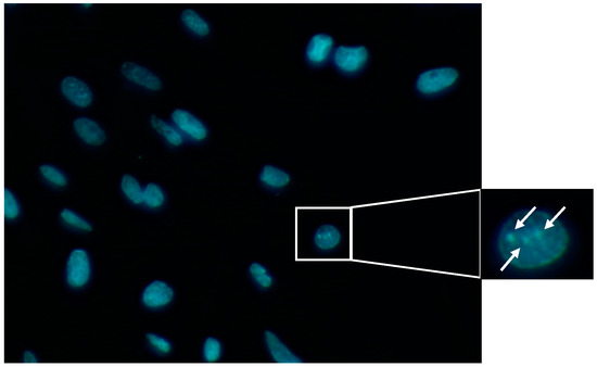 Example of an image obtained through Hoechst assay. In the picture is pointed the chromatin condensation.