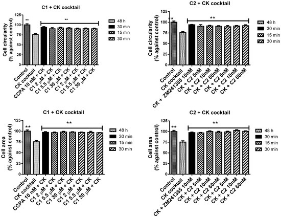Cell area and circularity after the pre and post treatment with CCPA or C1 and ZM241385 or C2 respectively in presence of the CK cocktail in mixed glial cell cultures. The results represent the average of 3–5 independent experiments. ** p < 0.01 of treated cells against CK.