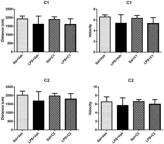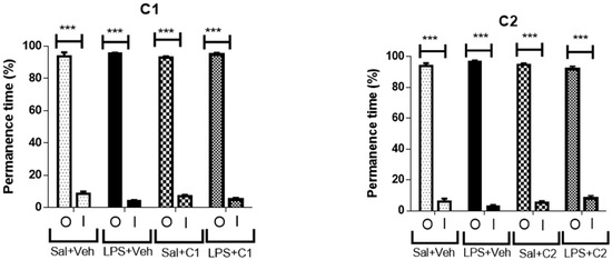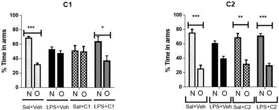 After assessing that locomotor behaviour was preserved and not different between the groups it was evaluated short-term memory using the Y Maze. In this paradigm, animals are left to explore the maze with one of the Y maze arms closed off, for 8 min. After 1 h the animal is reinserted in the maze, but this time all arms are available for exploration. The animal’s natural behaviour is to spend more time exploring the previously closed off arm, since this is a new environment, and animals have a natural preference for novelty. The arms that were accessible from the beginning are considered the “other arms” (O), while the “new unexplored arm” is the novel arm (N). Control groups (Vehicle + Saline), as expected, showed a preference for the novel arm (Figure 15). Upon a neuroinflammatory stimulus with LPS, animals showed no preference for the novel arm, as can been seen in the LPS + saline groups, demonstrating that this insult produces impairment in short-term memory performance. This phenotype was rescued by administration of either C1 or C2 compounds, suggesting that these compounds are able to neuroprotect cells from the effects of the inflammatory insult. When administered alone, C1 resulted in a reduction in the short-term memory performance, while C2 was devoid of any effects in memory performance.