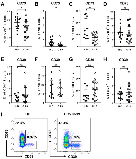 3.3. Expression of CD39 and CD73 by Lymphocyte Subsets from COVID-19 Patients and Healthy Controls