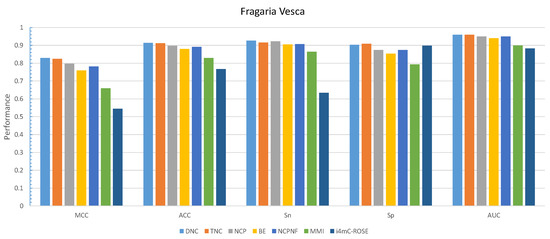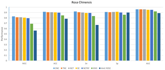 By comparing the effectiveness of the proposed methods with i4mC-ROSE model which used the same datasets, the DNC scheme yielded MCC, ACC, Sn and Sp of 0.829, 0.914, 0.926, and 0.903, respectively as the best performances for F. vesca dataset (Figure 2). Similarly, it achieved 0.828 for MCC, 0.914 for ACC, 0.919 for Sn and 0.910 for Sp as the maximum value on the R. chinensis dataset (Figure 3). The detailed performances of DNC as the best encoding method for ten different models on the R. chinensis dataset are given in Supplementary File 1. The TNC scheme yielded the highest value for Sp of 0.909 on the F.vesca dataset. Table 4, summarized the prediction performances by each six encoding methods and existing state-of-the-art model on F. vesca and R. chinensis datasets.