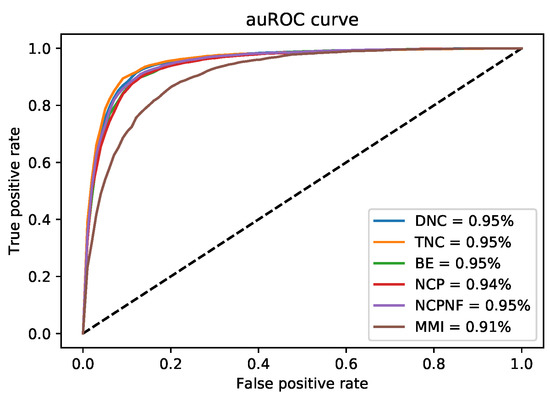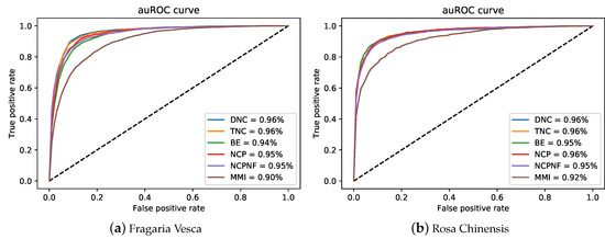 The ROC curve of six encoding models was shown in Figure 5 and compared to the i4mC-ROSE model for both genomes. On the F. vesca dataset, the DNC and TNC achieved the best performance with an AUC value of 0.96 followed by NCP, NCPNF, BE, and MMI (Figure 5a). However, the highest AUC value was presented by DNC, TNC, and NCP of 0.96 equally and next BE, NCPNF, and MMI provided 0.95, 0.95, and 0.92, respectively on R. chinensis dataset (Figure 5b). Besides, DNC, TNC, BE, NCNF, and NCP all have the highest value of 0.95 on training benchmark dataset cross-species (Figure 6).