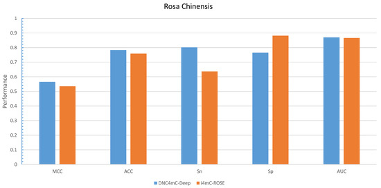 Grapical illustration of performance comparison between DNC4mC-Deep and state-of-the-art model on the independent Rosa Chinensis dataset.
