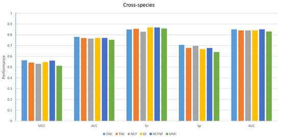 Furthermore, the performance evaluation by six different encoding models on the cross-species dataset is shown in Figure 4. The DNC scheme yielded the highest value for all those metrics except Sp which the TNC scheme achieved the highest value of 0.882 shown in Table 5.