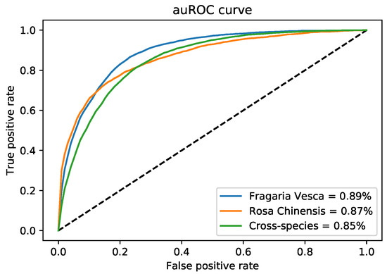auRoc curves of six encoding methods for the proposed model on new cross-species training benchmark dataset.