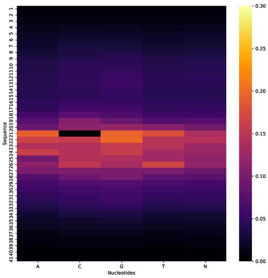 Kmer is a common feature encoding algorithm that has been widely used in various prediction works [28,29,45,48,49]. A DNA sample is expressed as V = N1, N2, N3, … NL, where L denotes the length of the sequence and Ni is one of the regular nucleotides A, C, G, T, and N. In this work, di-nucleotide composition (DNC) and tri-nucleotide composition (TNC) were considered. In DNC all samples of 41 nt produce 40 components with the equation of . The DNC scheme generated a 25 dimensional feature. Whereas in TNC samples of 41 nt generated 39 elements with the equation of . The TNC form into a 125 ()-dimensional vector. In both equations, the L denotes the length of the sequence and k represents the value of Kmer as an integer.