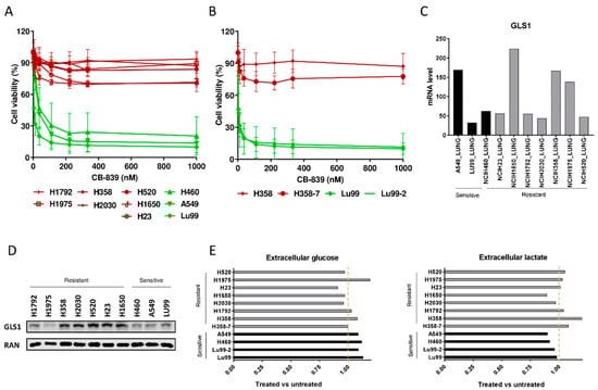We also checked whether the different response to CB-839 treatment in our NSCLC cells was due to a different basal expression of GLS1. The expression data from the Cancer Cell Line Encyclopedia (CCLE) and from our Western blot analyses excluded this, considering that both the sensitive and the resistant cell lines showed comparably heterogeneous GLS1 mRNA and protein levels (Figure 1C,D). We also excluded the possibility that resistant cells could increase the glycolytic axis to overcome the glutamine dependence; all the NSCLC-treated cells had comparable uptake and release of glucose and lactate in the extracellular compartment, independently from their response to treatment (Figure 1E).