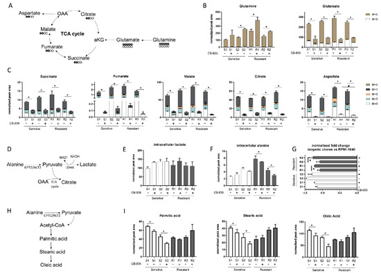 We sought evidence that anabolic processes in the resistant cells were maintained by examining the intracellular levels of FFAs (palmitic, stearic and oleic acid synthesis) (Figure 2H). There were significant decreases in all the FFA levels in the sensitive clones, but not in the resistant ones after CB-839 (Figure 2I). These results are consistent with the ability of resistant clones to sustain cellular anabolic processes after glutamine withdrawal induced by CB-839 through the uptake and catabolism of alanine, in accordance with unlabeled aspartate formation. The reductions of all FFA levels in the sensitive clones indicated the activation of a catabolic process to feed the sensitive cell’s metabolism (Figure 2I).