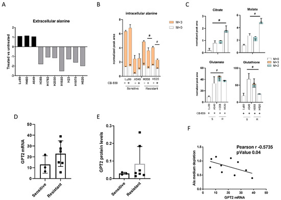 (A) Changes in extracellular alanine levels in the panel of ten NSCLC cell lines, CB-839-treated vs. untreated, cells (500 nM, 24 h treatment). (B) Unlabeled and 13C3-labelled alanine incorporation (M + 0, M + 3) in two sensitive (LU99, A549) and two resistant (H358, H520) cells, either untreated or CB-839 treated (500 nM, 24 h treatment). (C) The 13C3-alanine-derived carbon labelling (M + 2, M + 3, normalized peak area) of TCA cycle intermediates and citrate, malate, glutamate and glutathione derived metabolites in CB-839 treated sensitive and resistant cells. (D) GPT2 mRNA expression as RNA-seq, retrieved from the CCLE in the sensitive and resistant cells. (E) Western blot analyses of GPT2 expression in the NSCLC cell line panel. Ran was used as loading control. (F) Pearson correlation between alanine uptake from each cell line’s medium and GPT2 mRNA expression, retrieved from the CCLE. The average of three independent experiments is reported. Statistical significance # p < 0.05 refer to significant differences (one-way ANOVA and Tukey Kramer test) of M + 2 and M + 3 in the resistant vs. sensitive cells.