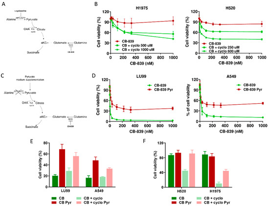 (A) Schematic representation of metabolic strategy to overcome CB-839 resistance, targeting GPT2 by l-cycloserine (cyclo). (B) Dose–response curves of H1975 (left panel) and H520 (right panel) cells treated with increasing concentrations of CB-839, alone (CB-839) or with l-cycloserine (CB + cyclo) at the reported concentrations. The response to the drugs was assessed with the MTS assay 72 h from the treatment start. (C) Schematic representation of metabolic strategy to induce CB-839 resistance in the sensitive cell lines by pyruvate supplementation, with inhibition of GLS1, alone or together with GPT2. (D) Dose–response curves of LU99 (left panel) and A549 (right panel) cells treated with increasing concentrations of CB-839, grown and treated in standard (CB-839) or pyruvate-enriched medium (CB-839 Pyr). The response to the drug was assessed with the MTS assay 72 h from treatment start. (E) Histograms of LU99 and A549 cells grown in standard or pyruvate-enriched medium (Pyr) and treated with CB-839 (CB, 12 nM for LU99 and 111 nM for A549) and l-cycloserine (cyclo, 75 µM for LU99 and 100 µM for A549), either alone or in combination. The response to the drug was assessed 72 h from the start of treatment with the MTS assay. (F) Histograms of H520 and H1975 cells grown in standard or pyruvate-enriched medium (Pyr) and treated with CB-839 (CB, 1000 nM) and l-cycloserine (cyclo), 250 µM for H520 and 500 µM for H1975), either alone or in combination. The response to the drug was assessed with the MTS assay 72 h from treatment start. The average of three independent experiments is reported. For the sake of clarity, the statistical significance one-way ANOVA and Bonferroni post-test for multiple comparisons (panel B,D,E,F) are reported as Supplemental Table S1, Table S2, Table S3 and Table S4, respectively).