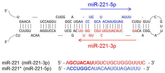 The sequences of miR-221 and miR-221*. Mature sequence of miR-221-5p is in blue, while miR-221-3p is shown in red. The seed sequence of the miRNA is highlighted.