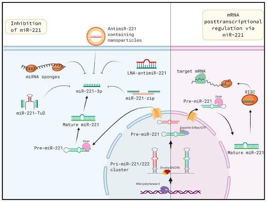 MiR-221 is encoded and transcribed together with miR-222 as pri-miR-221/222. These two miRNAs are paralogous and share the same seed sequence. The promoter of pri-miR-221/222 is located upstream of miR-222, while three poly(A)-signals are located downstream of miR-221, and the miRNAs are separated by 726 bp. The pri-miR-221/222 is processed in the nucleus by the “microprocessor” complex composed of the enzyme Drosha and RNA binding protein DiGeorge syndrome critical region gene 8 (DGCR8). DGCR8 and Drosha are essential for the nuclear processing of microRNAs; the deficiency of either of them results in the global loss of miRNAs [3,4,5]. Nuclear processing of pri-miR-221/222 leads to the generation of the individual precursors, pre-miR-221 and pre-miR-222. Pre-miR-221 possesses a hairpin and is exported via the exportin5-RanGTP-shuttle system into the cytoplasm where it is further cleaved by the enzyme Dicer into the mature miR-221, whose sequence is shown in Figure 1 [5,6]. The 5′ end of pre-miR-221 gives rise to miR-221-5p, which is also known as miR-221* (star) miRNA. Similarly, the 3′ strand of pri-miR-221 generates miR-221-3p, which is interchangeably used with miR-221. This review focuses on miR-221-3p, which will henceforth be referred to as miR-221. The mature miR-221, upon loading into the RNA-induced silencing complex (RISC), regulates gene expression on a posttranscriptional level by binding to the 3′ UTR of target mRNAs (Figure 2).