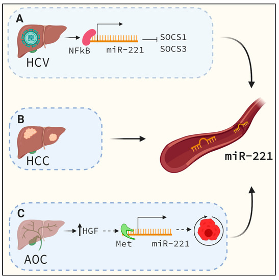 The main etiologies of liver fibrosis are chronic viral hepatitis infection, NASH and cholestatic diseases. If left untreated, extensive liver fibrosis often leads to the development of HCC. At present, the most commonly used method to diagnose liver disease is biopsy, which is invasive and often time-consuming. More importantly, the biopsy is often performed at later stages, by which time the only effective treatment option is transplantation. MiR-221 has been shown as a miRNA that can serve as a serum biomarker for diagnosis, to distinguish different diseases and as a marker of recovery. (A) HCV is one of the most prevalent causes of liver fibrosis. Multiple studies have shown miR-221 upregulation in the sera of patients with HCV. Furthermore, in HCV, miR-221 expression is under the control of NF-Kb, and it targets SOCS1 and SOCS3. (B) HCC is the fourth leading cause of cancer-related deaths worldwide. High levels of miR-221 have been detected in HCC tissues and in the sera of patients with HCC. Based on the serum levels, miR-221 can be used together with AFP as a biomarker of HCC development, severity and outcome. Patients with high miR-221 had more advanced HCC and lower survival rates than those with low miR-221 serum levels. (C) In contrast, in AOC, the upregulation of miR-221 in patient’s sera is considered a sign of recovery. In AOC, hepatocyte proliferation and liver regeneration occur due to high HGF signaling. HGF is the key ligand for the receptor tyrosine kinase, c-Met, which, in turn, enhances miR-221 transcription. High levels of miR-221 in the liver repress SOCS1 levels. Since SOCS1 is an inhibitor of HGF signaling, its repression by miR-221 leads to enhanced HGF signaling and active liver regeneration and recovery.