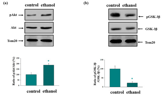 It is well known that protein kinases participate in different signaling pathways in the mitochondria. In particular, it was reported that the serine/threonine kinases GSK-3β and Akt are involved in the molecular pathophysiology of many mitochondria-related diseases and pathological conditions, such as Alzheimer’s disease and Parkinson’s disease, and also numerous pathologies of the heart [44,45]. Here, we examined whether chronic ethanol exposure has an effect on the amount and phosphorylation level of mitochondria-associated GSK-3β and Akt. Panel 1a illustrates an almost two-times increase in the level of Akt phosphorylation in Ethanol RLM (rat liver mitochondria isolated from rats subjected to chronic ethanol intoxication) compared to the Control RLM. At the same time, the level of phosphorylation of GSK-3β under the same conditions was five times lower (see the lower part of Figure 1b).