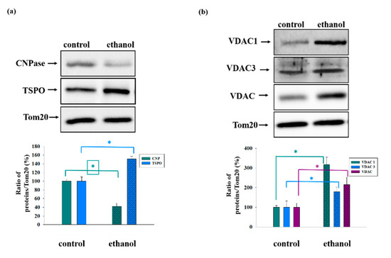Alterations in the levels of translocator protein (TSPO), CNPase (Panel (a)), and voltage-dependent anion channel (VDAC 1, VDAC 3, and total VDAC) (Panel (b)) in the outer mitochondrial membranes of the Control and Ethanol RLM. The upper parts represent Western blots stained with the corresponding antibodies. The lower parts present the quantitation of immunostaining using computer-assisted densitometry. The protein band intensity was quantified after normalization to Tom 20. The values shown are the means ± SD from three independent experiments; * p ≤ 0.05 compared with the control.