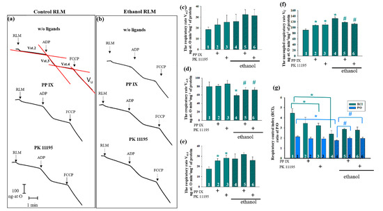 The effects of protoporphyrin IX (PPIX) and PK11195 on the respiratory activity of the Control and Ethanol RLM: curves of the respiratory activity of the Control (a) and Ethanol (b) RLM. Arrows show the times at which RLM (rat liver mitochondria), ADP (adenosine diphosphate), and FCCP (carbonyl cyanide-4-(trifluoromethoxy)phenylhydrazone) were added; (c–f) quantitative analysis of the RLM respiration rate in states 2, 3, and 4, as well as the uncoupled respiration rate; (g) respiratory control index (RCI) values and phosphate/oxygen (P/O) ratio; the shown values are the means ± SD from three independent experiments; * p ≤ 0.05 compared with the value in the Control RLM without additions (Column 1); # p ≤ 0.05 compared with the value in the Ethanol RLM without additions (Column 4).
