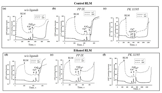 The Ca2+ and TPP+ flows of RLM were determined with TPP+- and Ca2+-sensitive electrodes (Nico, Russia) in a 1 mL measuring chamber [35]. The mitochondria (2 mg protein/mL) were incubated at 25 °C in a medium containing 125 mM KCl, 10 mM Tris (pH 7.4), and 2 mM K2HPO4; glutamate (5 mM) and malate (5 mM) were used as substrates. The mPTP opening in RLM was induced by a threshold Ca2+ concentration (the first addition of Ca2+ contained 50 nmol Ca2+ per mg of protein, while the second and third contained 90 nmol Ca2+ per mg of protein). The parameters of Ca2+ transport, such as the calcium retention capacity (CRC—concentration of Ca2+ added to the mitochondrial suspension in which the Ca2+ ions accumulating in the mitochondria induce the mPTP to open) and the lag phase (the time between influx and efflux, s) were measured. The Ca2+-induced dissipation of the membrane potential was measured as the TPP+ efflux rate (VTPP+out, nmol min−1 mg−1 of protein). To study the influence of PK11195 and PPIX, they were pre-incubated with the mitochondria for 10 min at appropriate concentrations (5 µM PPIX and 100 nM PK11195).