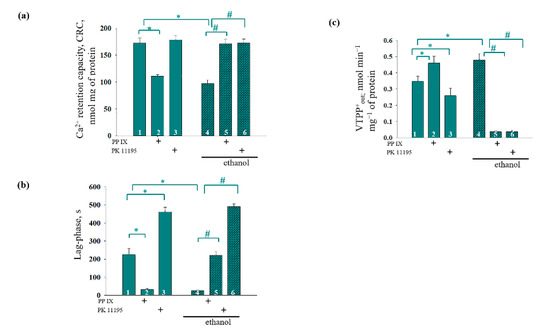 Quantitative analysis of the action of PPIX and PK11195 on the Ca2+-induced mitochondrial permeability transition pore (mPTP) opening in the Control and Ethanol RLM; (a) quantitative analysis of the CRC (calcium retention capacity) and (b) quantitative analysis of the lag phase; (c) quantitative analysis of VTPP+out. The values shown are the mean ±SD from three independent experiments; * p ≤ 0.05 compared with the control value in the RLM without additions (column 1); # p ≤ 0.05 compared with the control value in the Ethanol RLM without additions (hatched column 4).