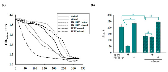 The effect of PPIX and PK11195 on the Ca2+-induced swelling of the Control and Ethanol RLM. (a) Curves of RLM swelling. (b) Average half-times (T1/2) of swelling. The values shown are the mean ±SD from three independent experiments; * p ≤ 0.05 compared with the control value in the Control RLM without additions (cyan column 1), # p ≤ 0.05 compared with the control value in the Ethanol RLM without additions (hatched column 4).