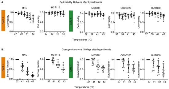 The cell viability of RKO cells decreases significantly after hyperthermia treatment with a 30% reduction after a 43 °C treatment compared to control, whereas HCT116 does not show any differences in cell viability after hyperthermia treatment (Figure 1A). All CMS4 cell lines demonstrate decreased cell viability with almost 20% less cell viability of HUTU80 cells after treatment at 43 °C compared with untreated cells.
