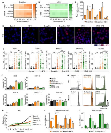 The effect of oxaliplatin is temperature-dependent, mitomycin-C (MMC) is effective at any temperature. To study the temperature-dependent effect of oxaliplatin and MMC, RKO, HCT116, MDST8, COLO320, and HUTU80 cells were exposed to oxaliplatin or MMC under hyperthermic condition for 60 min. Cell viability assays were performed at 48 h after treatment with oxaliplatin (A) or MMC (B). Thermal Enhancement Ratio (TER) values are demonstrated by a color gradient: a darker color indicates higher TER values. Data represent the mean of 3 independent experiments. (C) The cellular uptake of oxaliplatin was assessed by measuring platinum uptake in cells using the CyTOF at 1 h after treatment. Means ± standard error of the mean of 3 independent experiments are presented. (D) DNA double strand breaks were measured by nuclear γ-H2AX staining. Representative pictures of RKO cells stained for γ-H2AX are presented. (E) Quantification of induced foci in RKO, HCT116, MDST8, COLO320, and HUTU80 cells. Data present the number of foci in 150 cells from 3 independent experiments. Apoptosis levels (F) and cell-cycle distribution (G) were studied using the Nicoletti assay, which was performed 48 h after treatment. Means ± standard error of the mean of 3 independent experiments are presented. Representative flow charts of RKO and MDST8 cells are depicted. (H) Live cell imaging was used to study the growth of RKO cells after treatment. Clonogenic survival assays were performed to assess long-term cell survival 10 days after oxaliplatin (I) or MMC (J) treatment. Means ± standard error of the mean of 4 independent experiments are presented. * p < 0.05, *** p < 0.001, **** p < 0.0001.