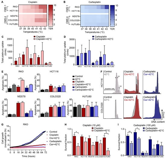 The effect of cisplatin and carboplatin is also temperature-dependent in colorectal cancer cells. To study the temperature-dependent effect of other platinum-based drugs, RKO, HCT116, MDST8, COLO320, and HUTU80 cells were exposed to cisplatin or carboplatin, under hyperthermic condition for 60 min. Cell viability assays were performed 48 h after treatment with cisplatin (A) or carboplatin (B). Thermal Enhancement Ratio (TER) values are demonstrated by a color gradient: a darker color indicates higher TER values. Data represent the mean of 3 independent experiments. The cellular uptake of cisplatin (C) and carboplatin (D) was assessed by measuring platinum uptake in cells using the CyTOF at 1 h after treatment. Means ± standard error of the mean of 3 independent experiments are presented. Apoptosis levels (E) and cell cycle distribution (F) was studied using the Nicoletti assay, which was performed 48 h after treatment. Representative flow charts of HCT116 and COLO320 cells are presented. (G) Live cell imaging was used to study the growth of RKO cells after treatment. Clonogenic survival assays were performed to assess long-term cell survival at 10 days after cisplatin (H) or carboplatin (I) treatment. Means ± standard error of the mean of 4 independent experiments are presented. * p < 0.05, ** p < 0.01.