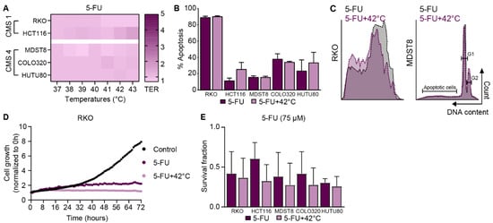 5-Fluorouracil (5-FU), as a systemic drug in combination with hyperthermic intraperitoneal chemotherapy (HIPEC) treatment. (A) Thermal Enhancement Ratio (TER) values of 5-FU obtained from cell viability assay are demonstrated by a color gradient: a darker color indicates higher TER values. The mean of 3 independent experiments are presented. Apoptosis levels (B) and cell cycle distribution (C) was studied using the Nicoletti assay, which was performed at 48 h after treatment with 5-FU. (D) Live cell imaging was used to give more insights about the growth of the cells after treatment. (E) Clonogenic survival assays were performed to assess long-term cell survival at 10 days after 5-FU treatment. Means ± standard error of the mean of 4 independent experiments are presented.