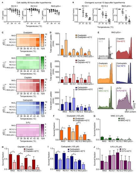 The effect of hyperthermia on p53 status was studied in RKO cells with wild-type p53 and in cells without functional p53, e.g., RKO cells transfected with HPV16-E6-1 (RC10.1) and HPV16-E6-2 (RC10.2), and in a dominant negative p53 mutant (RKO p53−/−). Cell viability (Figure 5A) and clonogenic survival assays (Figure 5B) were performed after cells were exposed to hyperthermia, chemotherapeutic drugs, or a combination of both. Hyperthermia alone decreased the cell viability and clonogenicity in all cell lines. Increased TER values for cisplatin, oxaliplatin, and carboplatin at temperatures of 41 °C and higher are seen in heat maps (Figure 5C). MMC and 5-FU did not demonstrate a temperature-dependent effect at 48 h after treatment.